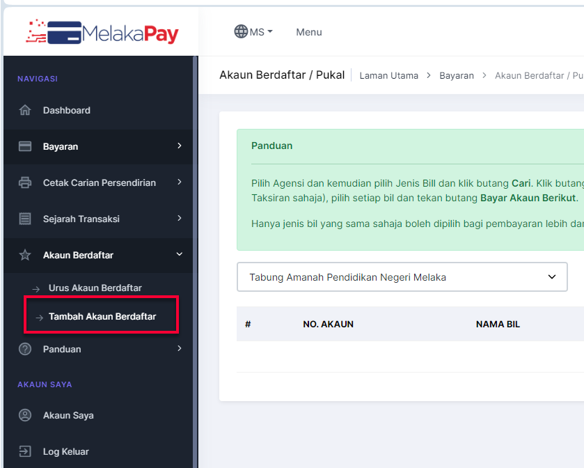 Langkah 5: Di Papan Pemuka Utama (Dashboard), klik pautan Tambah Akaun Berdaftar
