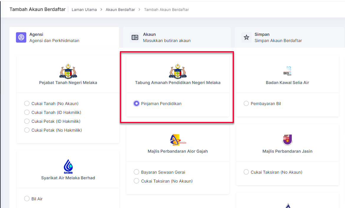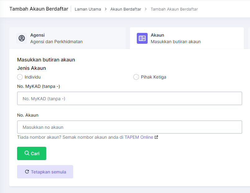 - Jenis Akaun: Persendirian (jika untuk diri sendiri) atau Pihak Ketiga (jika membayar untuk orang lain)